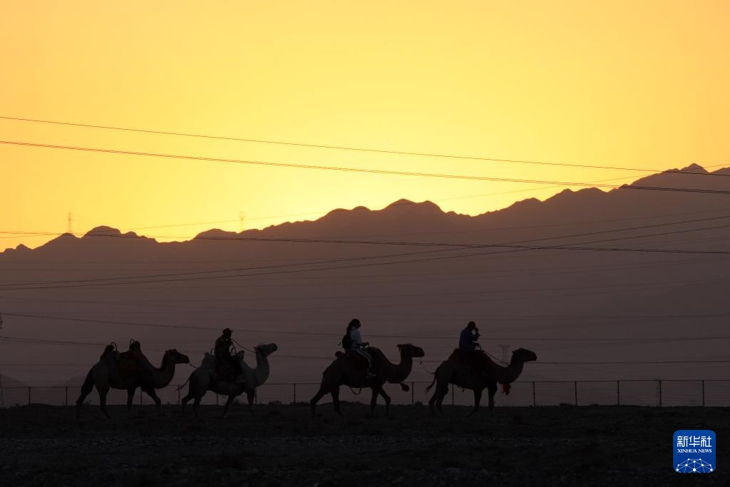 7月14日,黄昏时分,驼队从嘉峪关关城外走过。