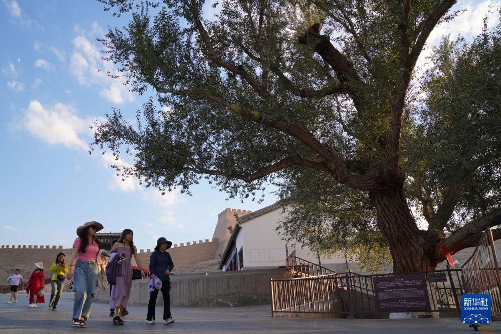 7月14日,游览嘉峪关关城的游客从“左公杨”下经过。这株杨树是百余年前左宗棠率军途中栽种的,有诗赞曰:“新栽杨柳三千里,引得春风度玉关”。