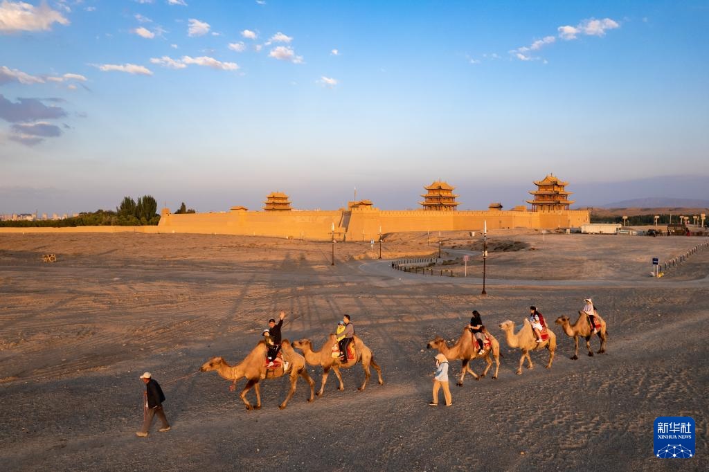 7月15日,游客在嘉峪关关城旁骑骆驼游览(无人机照片)。