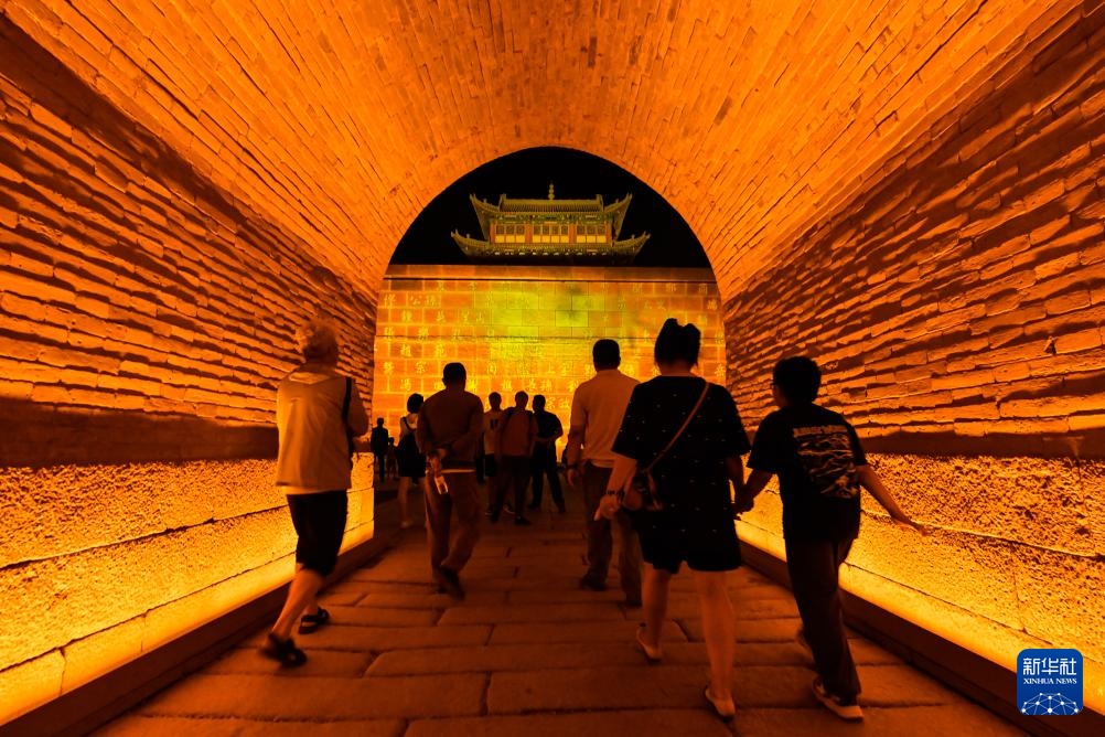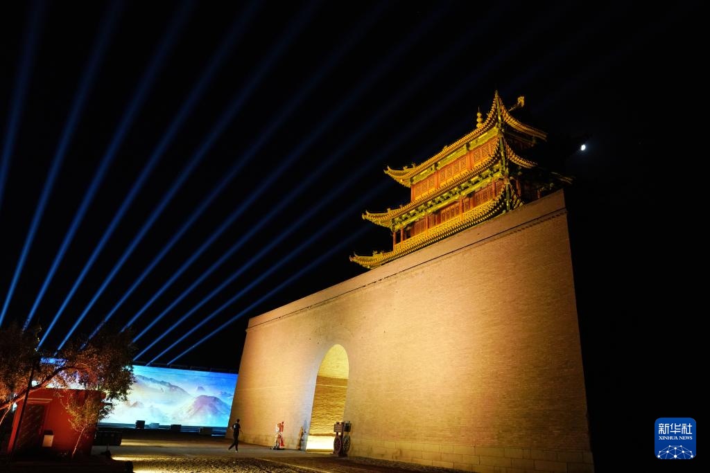 7月14日,工作人员在嘉峪关关城测试夜游光影效果。