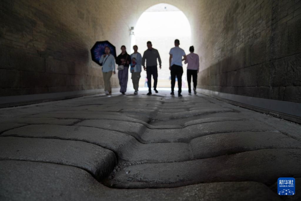7月14日,游客在嘉峪关关城游览。城门下的地面,在车轮的长期碾压下形成明显的车辙。