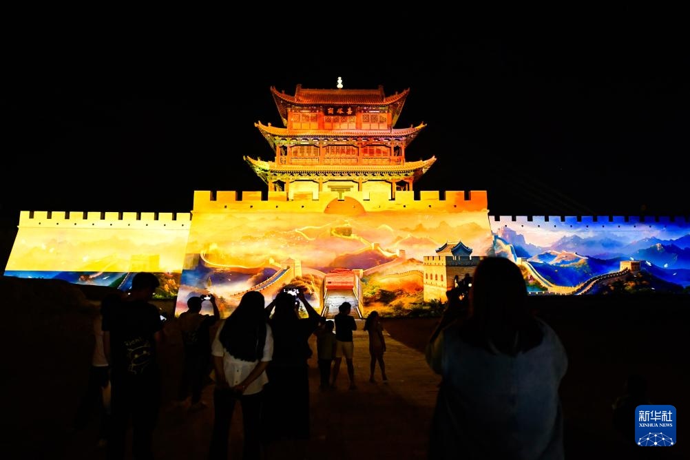 8月16日,夜游嘉峪关关城的游客在拍摄灯光秀。