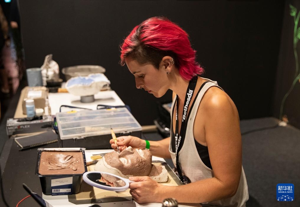 8月21日,一名女子在德国科隆举办的科隆国际游戏展上制作道具。