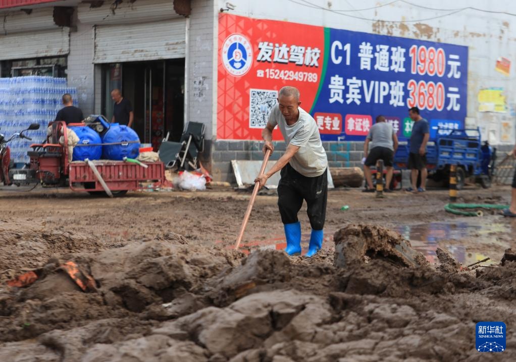 8月21日,在建昌县黑山科乡,一名居民在清理道路淤泥。