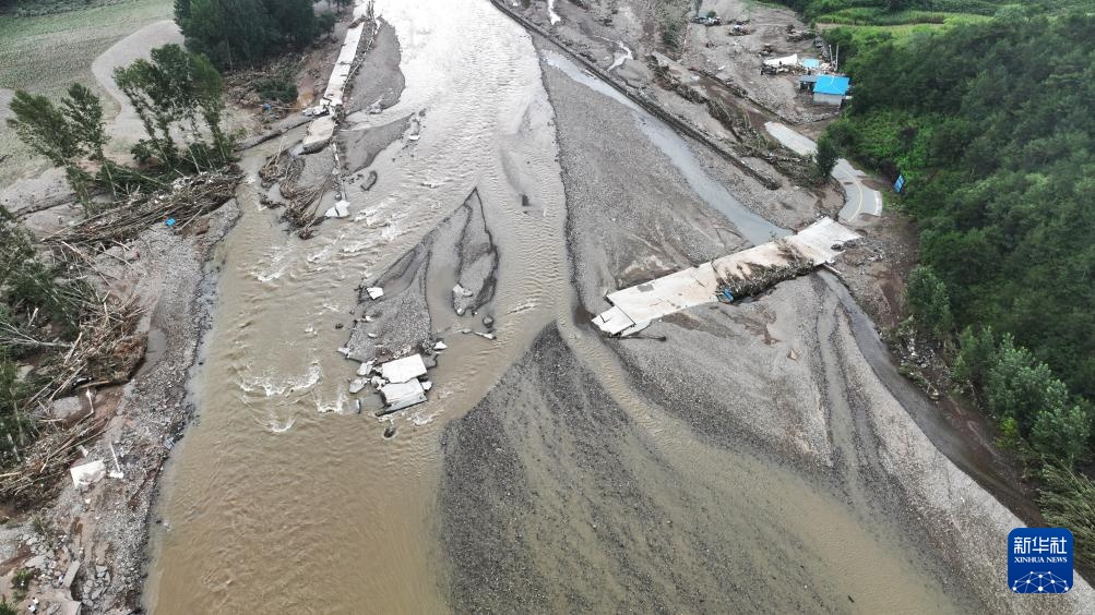 8月21日,在建昌县黑山科乡,一条河流上的桥梁被冲毁(无人机照片)。