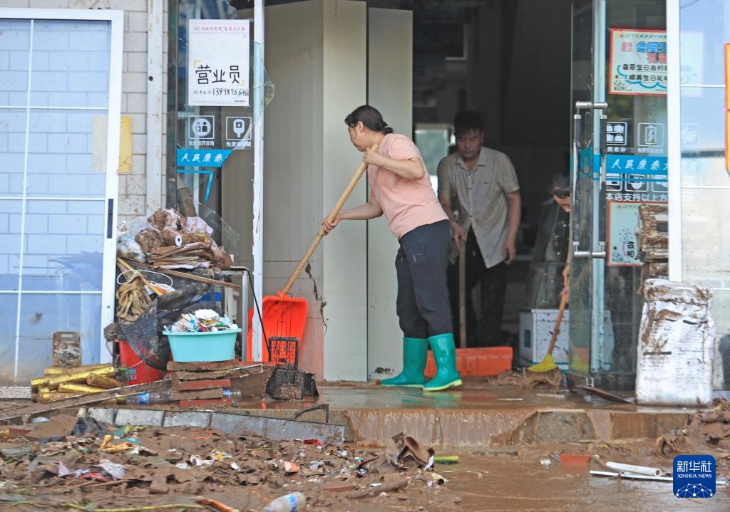 8月21日,在建昌县黑山科乡,受灾居民在清理店铺内积水。