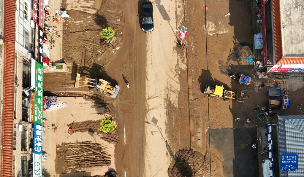 8月21日,在建昌县黑山科乡,救援车辆在清理道路淤泥(无人机照片)。