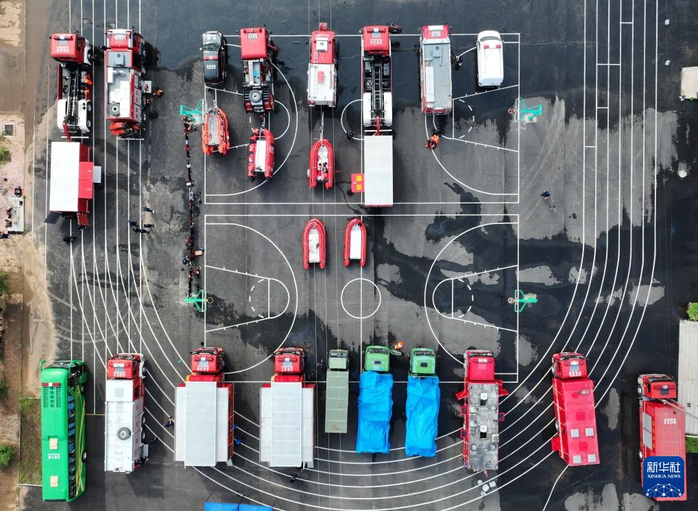 8月21日在建昌县黑山科乡初级中学拍摄的各方救援车辆(无人机照片)。