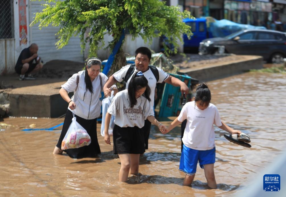 8月21日,在建昌县黑山科乡,居民蹚过积水。