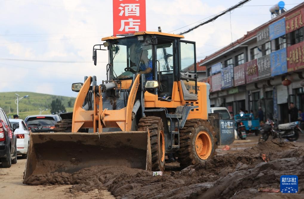 8月21日,在建昌县黑山科乡,救援车辆在清理道路淤泥。