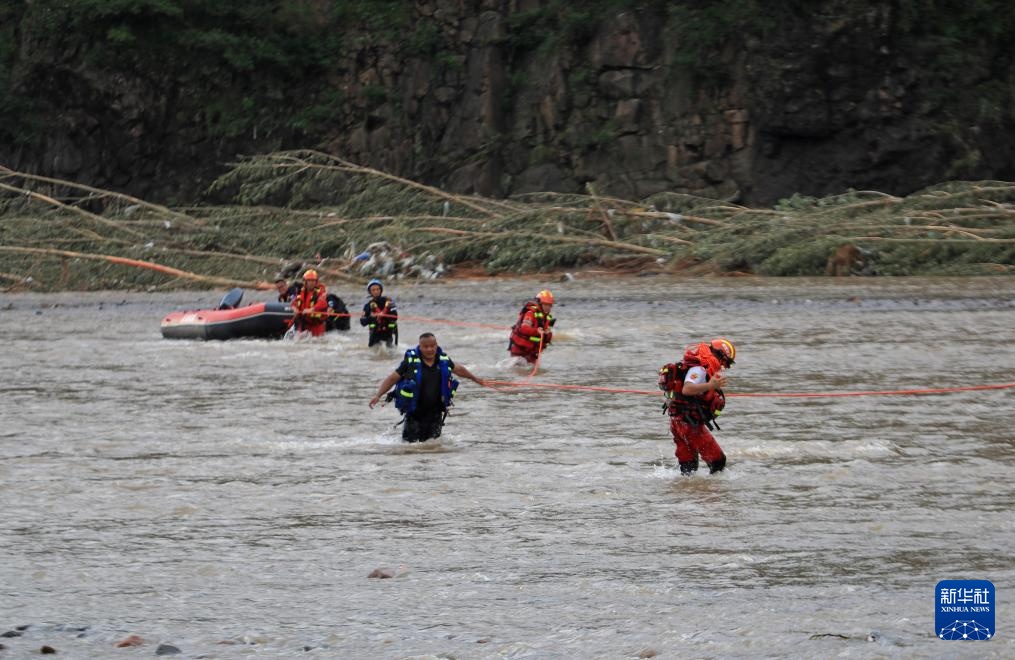 8月21日,在建昌县黑山科乡,来自山东的救援队伍给对岸受灾群众送去医疗物资后渡河返回。