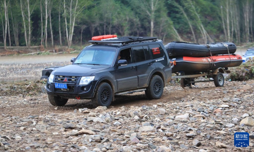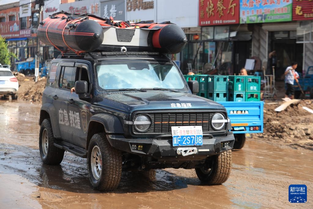 8月21日,在建昌县黑山科乡,一辆救援车辆携带冲锋舟行驶在受灾区域。