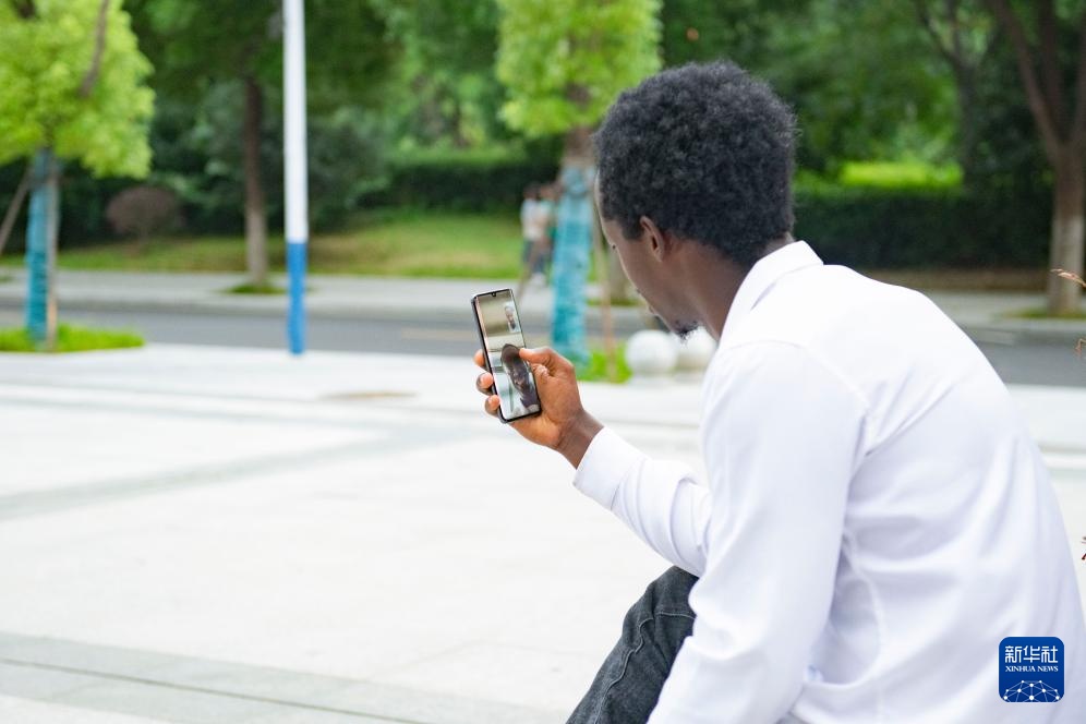 8月13日,在位于安徽省合肥市的安徽农业大学,孔七在校园内与家人视频通话。