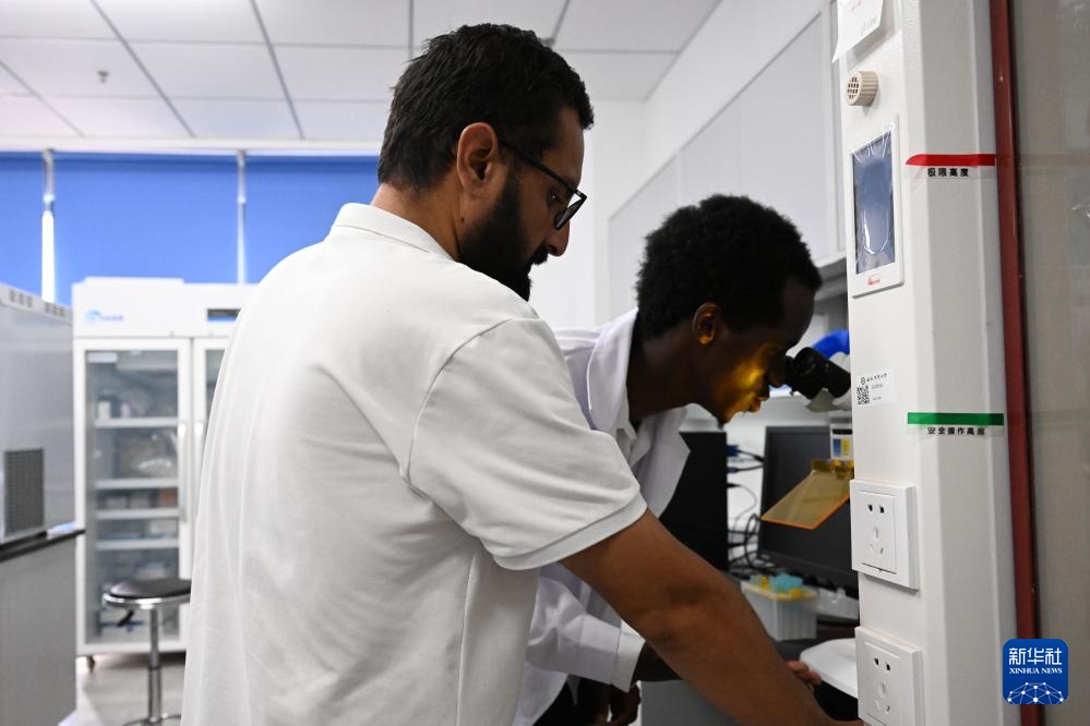 8月13日,在位于安徽省合肥市的安徽农业大学,孔七(右)和同学在实验室用显微镜观察花粉样本。