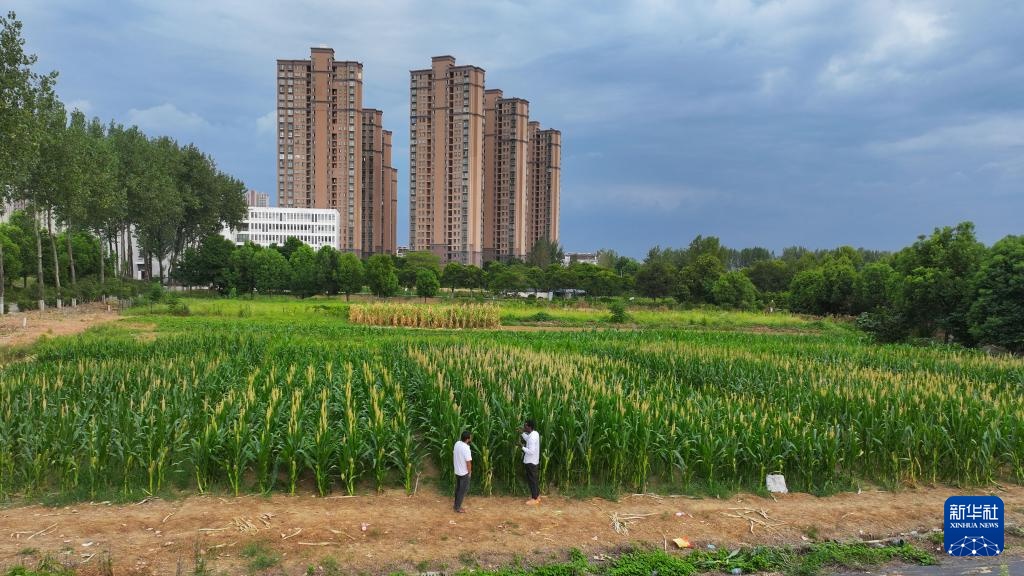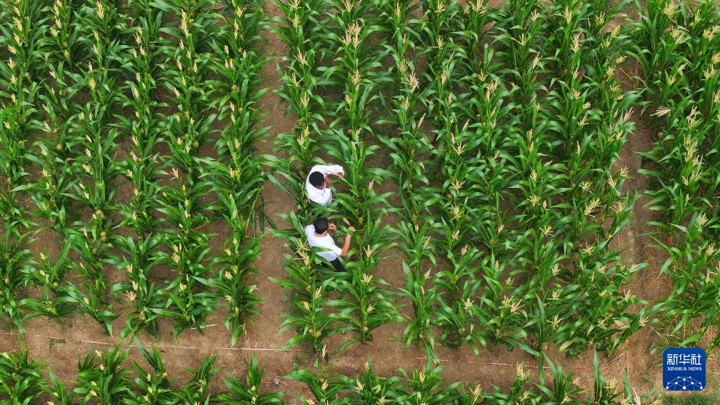 8月13日,在位于安徽省合肥市的安徽农业大学教学示范基地,孔七在试验田里查看玉米雄穗。