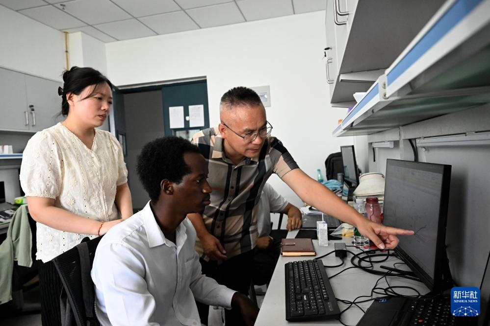 8月13日,在位于安徽省合肥市的安徽农业大学,孔七的导师宋有洪(右)在办公室内指导孔七(中)和其他学生学习。