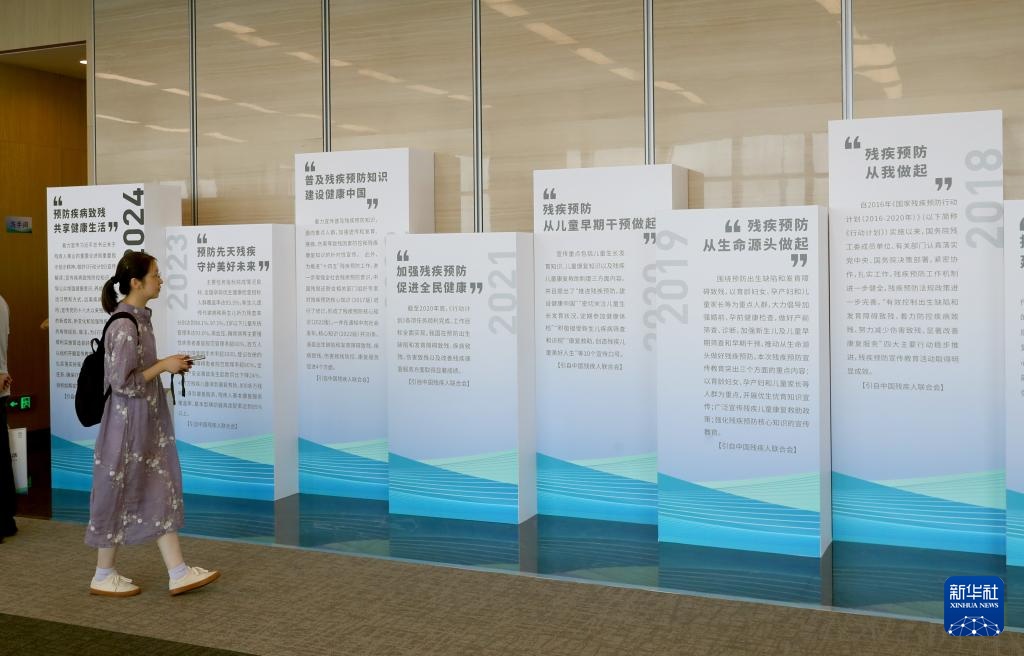 8月23日,一位参观者在残疾预防宣传展板前驻足观看。