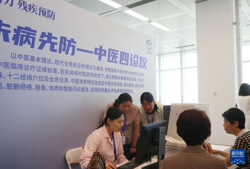 8月23日,参观者在活动现场观看工作人员(左)进行中医四诊仪的操作演示。