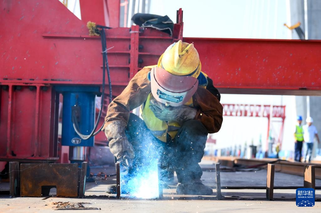 8月23日,工人在包银高铁乌海黄河特大桥建设现场施工。