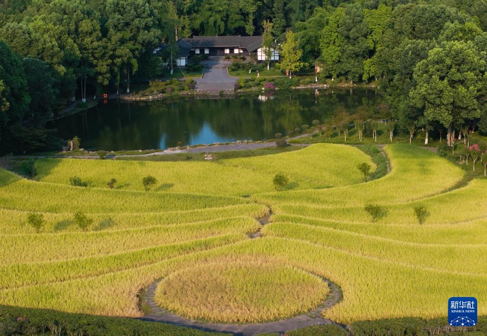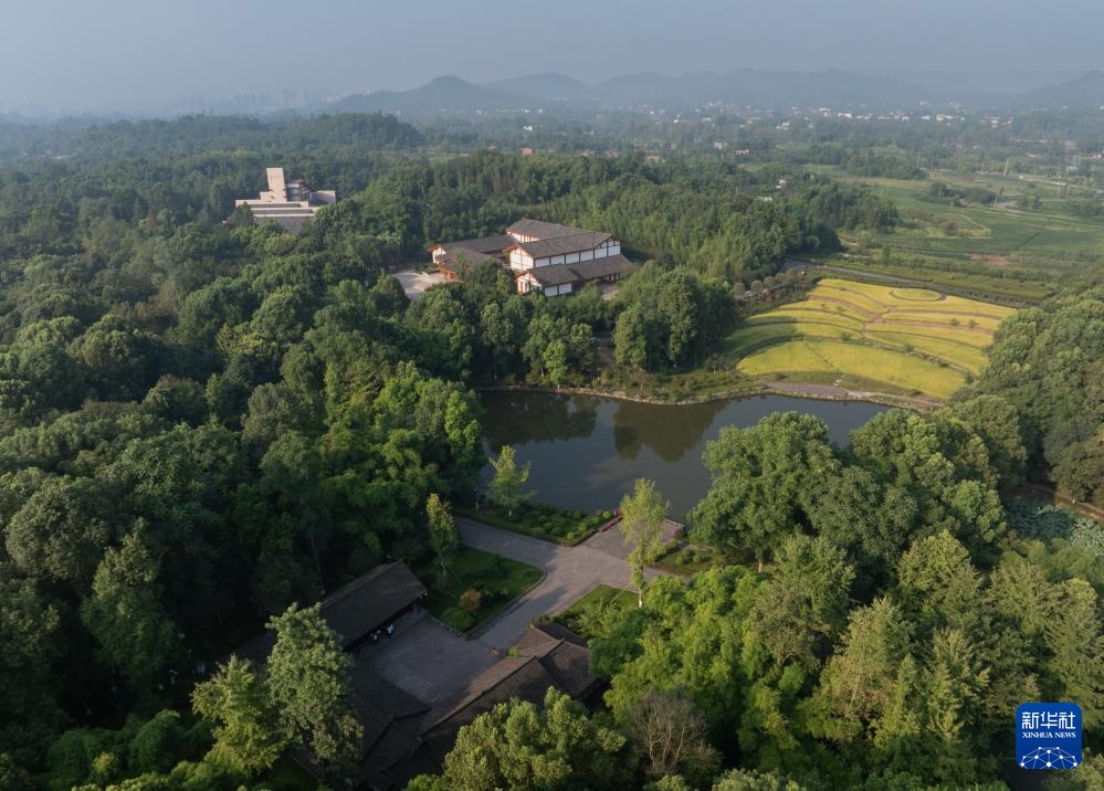 俯瞰邓小平故居及故居前的水塘、稻田(8月21日摄,无人机照片)。邓小平故里核心区是邓小平同志的诞生地,园区占地830亩,包含邓小平铜像广场、邓小平故居陈列馆、邓小平缅怀馆、邓小平故居等场所。