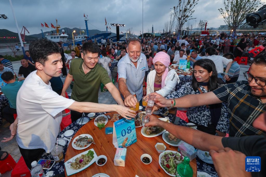 8月23日,游客在岱山县长涂镇举行的海岛特色黄鱼宴上举杯。