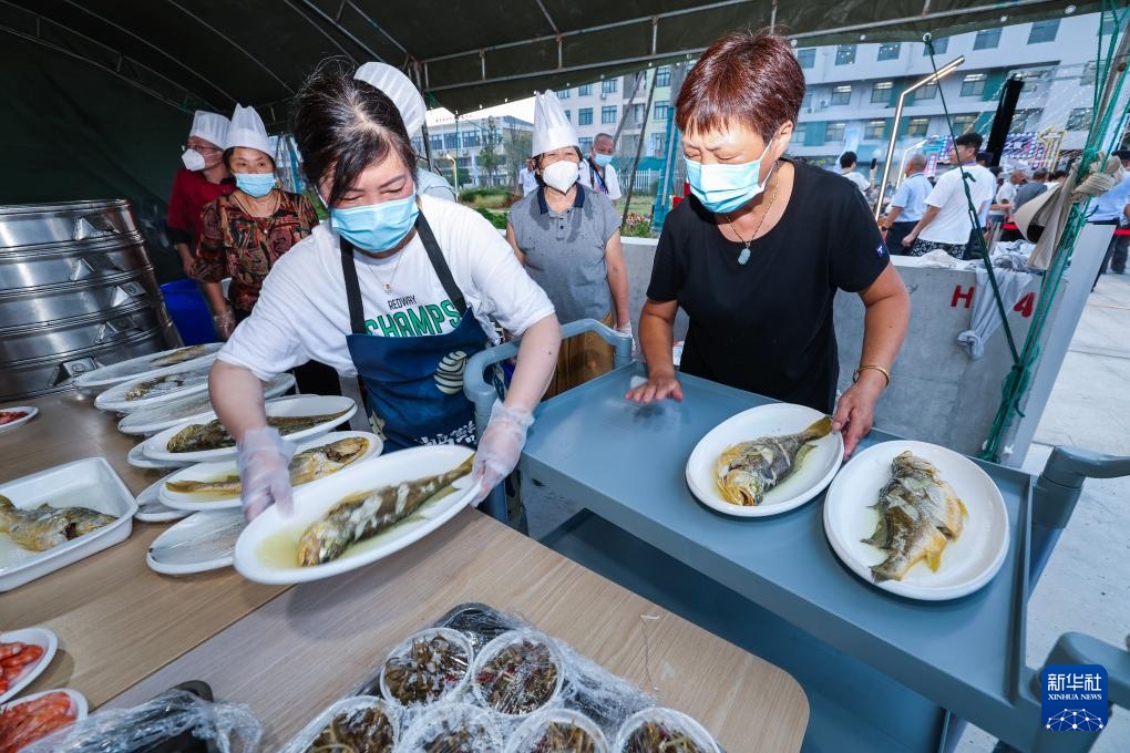8月23日,在岱山县长涂镇举行的海岛特色黄鱼宴上,渔嫂们准备上菜。