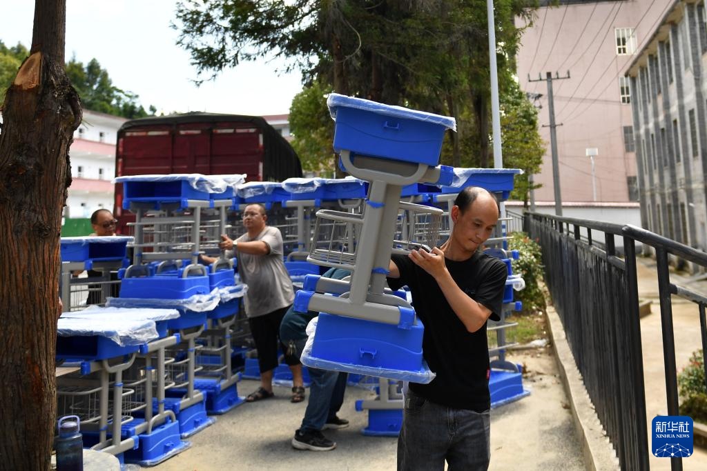 8月23日,工人们在资兴市第二中学搬运新课桌。
