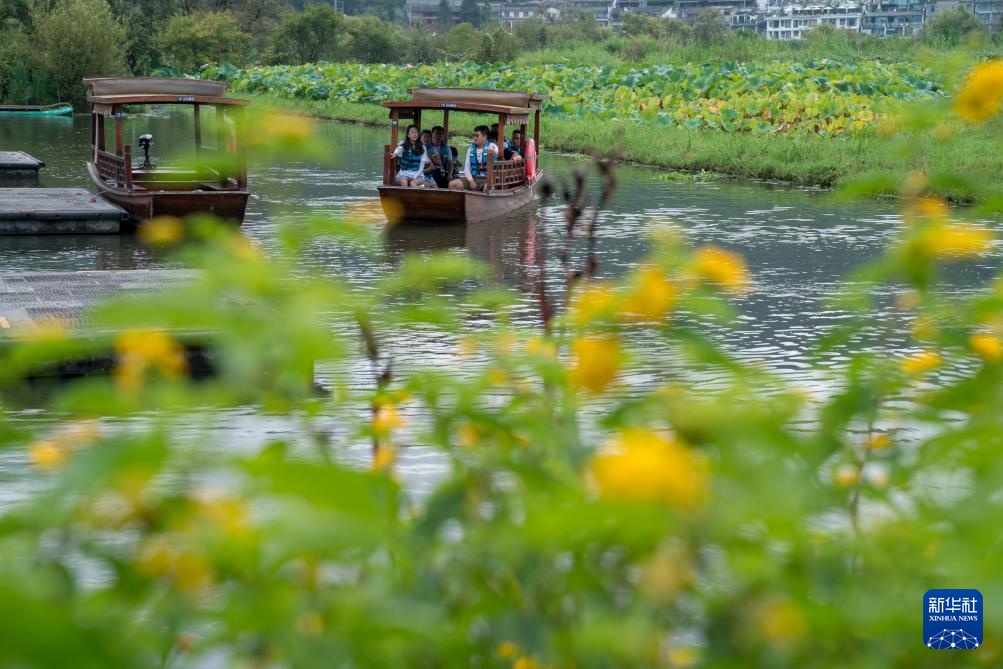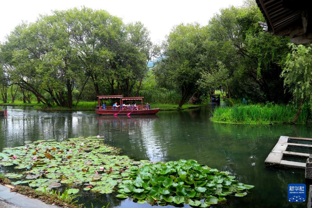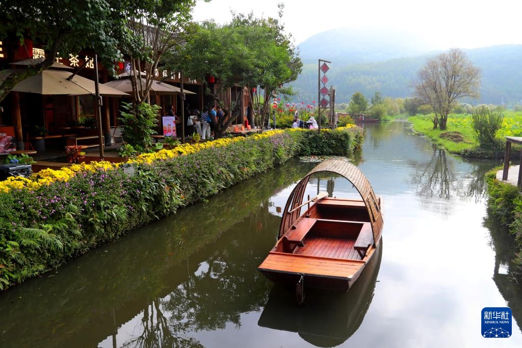 8月23日,游客在和顺古镇里乘船游玩。