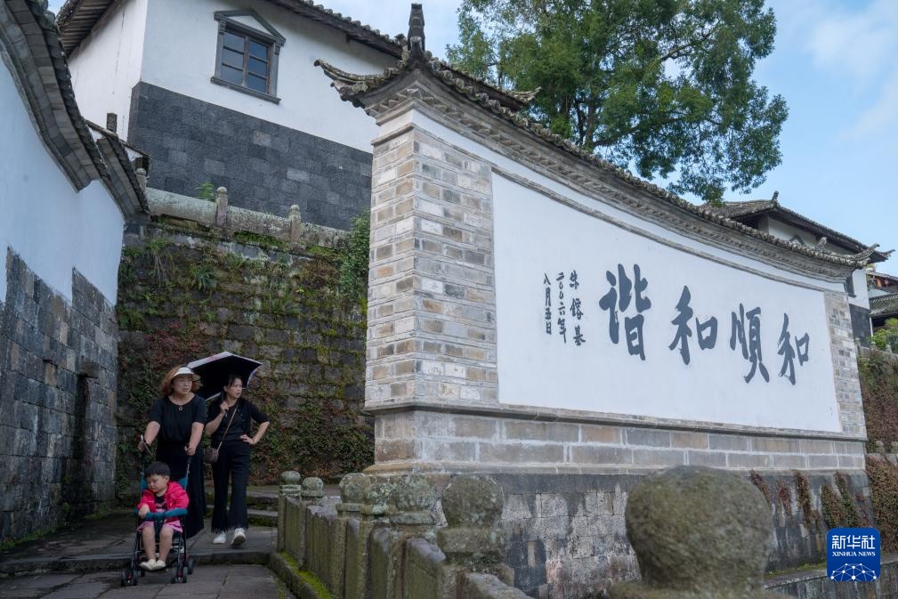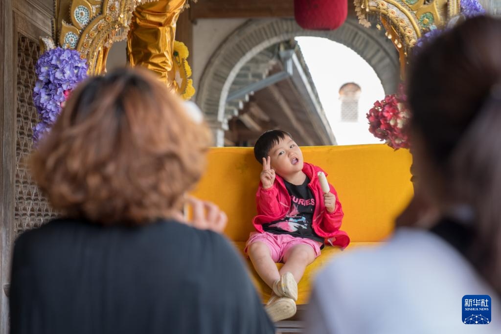 8月23日,小朋友在和顺古镇拍照留念。