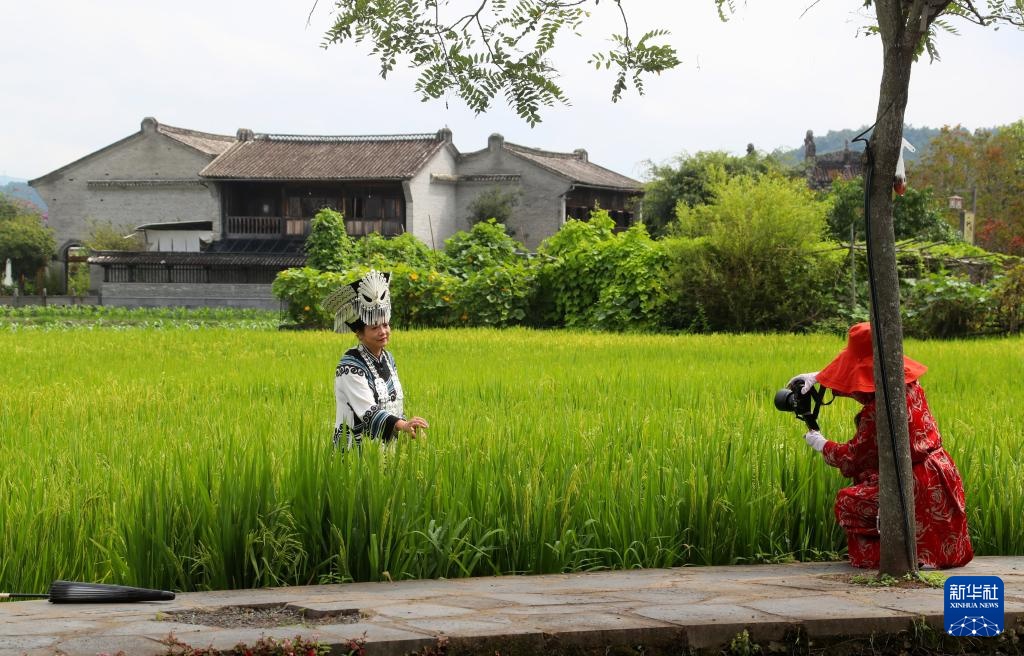 8月23日,游客在和顺古镇拍照留念。