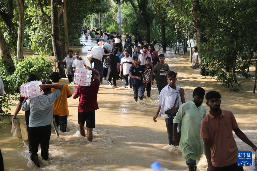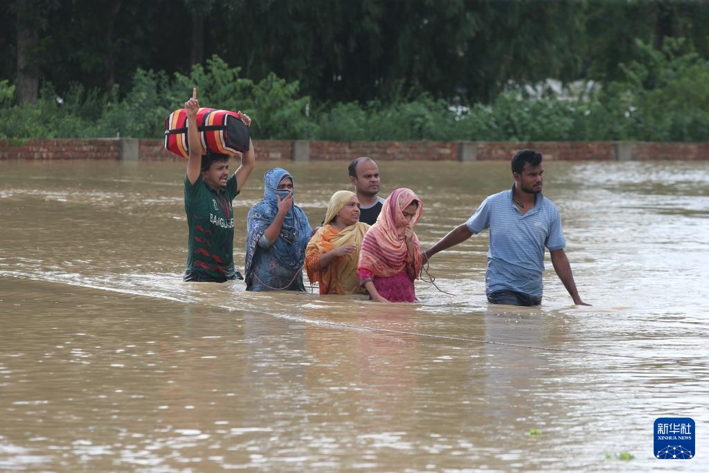 8月23日,在孟加拉国库米拉,人们走在被洪水淹没的道路上。