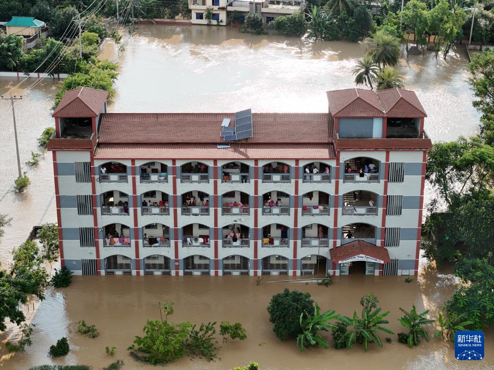 这是8月23日在孟加拉国库米拉拍摄的一所被洪水围困的学校(无人机照片)。