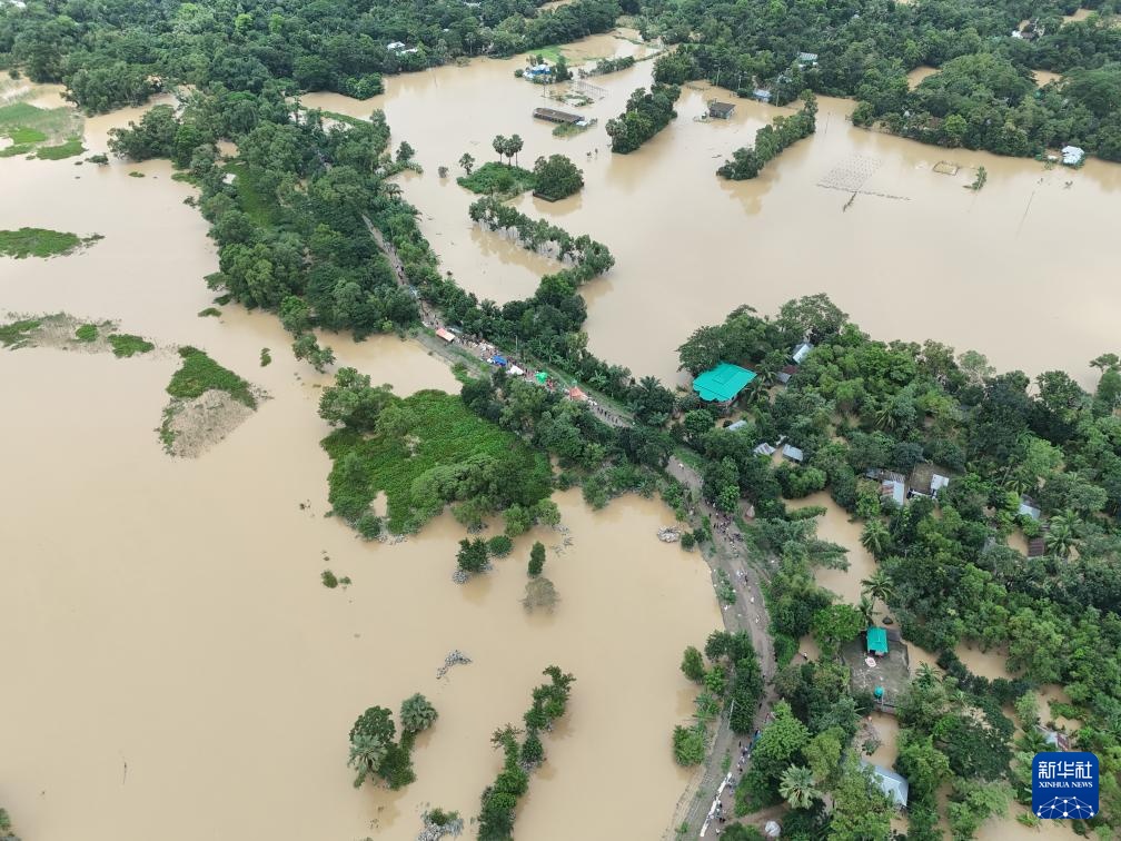 8月23日,人们走在孟加拉国库米拉遭遇洪灾侵袭的道路上(无人机照片)。