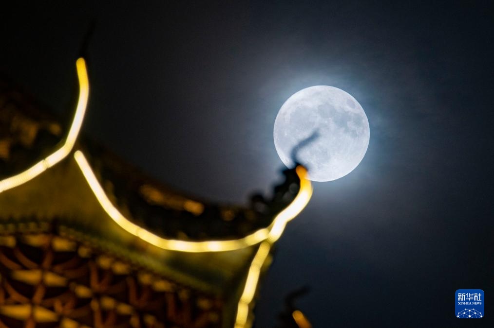 这是8月19日在贵州省黔东南苗族侗族自治州从江县鼓楼生态广场拍摄的“超级月亮”。