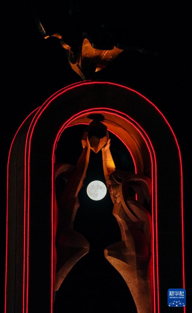 这是8月19日在位于宁夏银川市兴庆区的凤凰碑拍摄的“超级月亮”。凤凰碑又称“民族团结碑”,是银川的标志性建筑之一。
