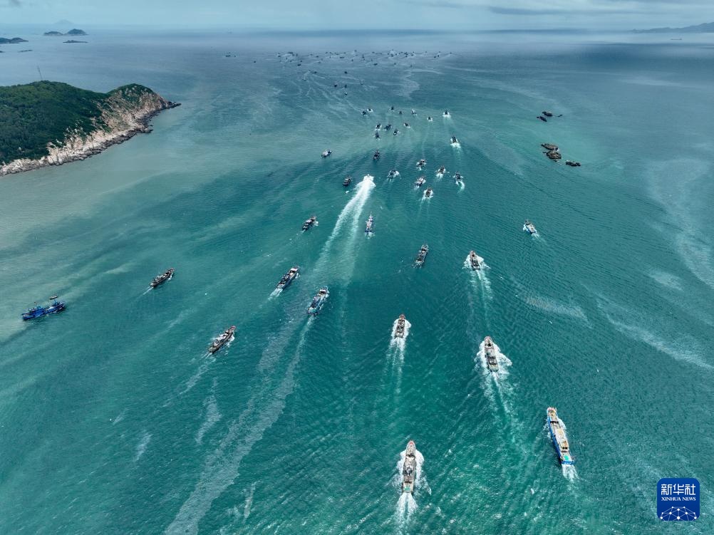 8月16日,在福建省福州市连江县黄岐国家中心渔港,渔船开渔出海(无人机照片)。