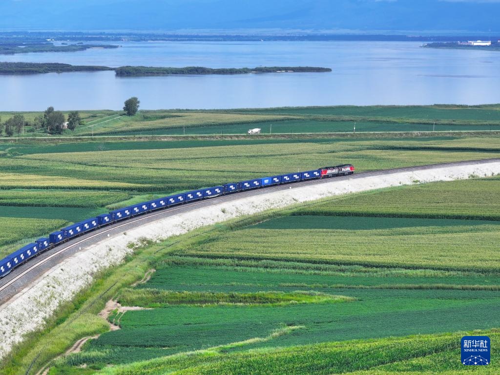 8月9日,一列中欧班列驶出黑龙江同江北站(无人机照片)。