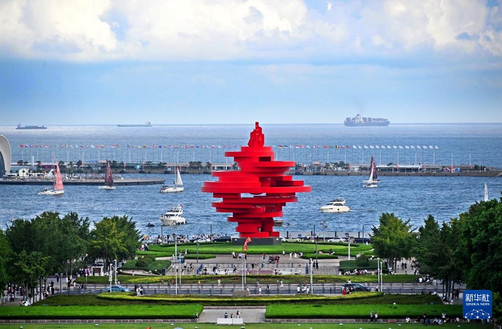 从五四广场远眺青岛奥林匹克帆船中心(8月19日摄)。