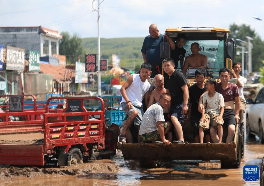 8月21日,在建昌县黑山科乡,受灾居民乘铲车进行转移。