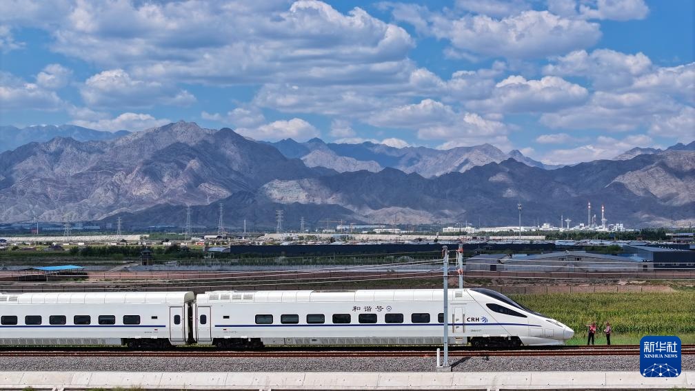 8月19日,一列动车组列车在包银高铁沙湖站至石嘴山站区间进行故障模拟演练(无人机照片)。