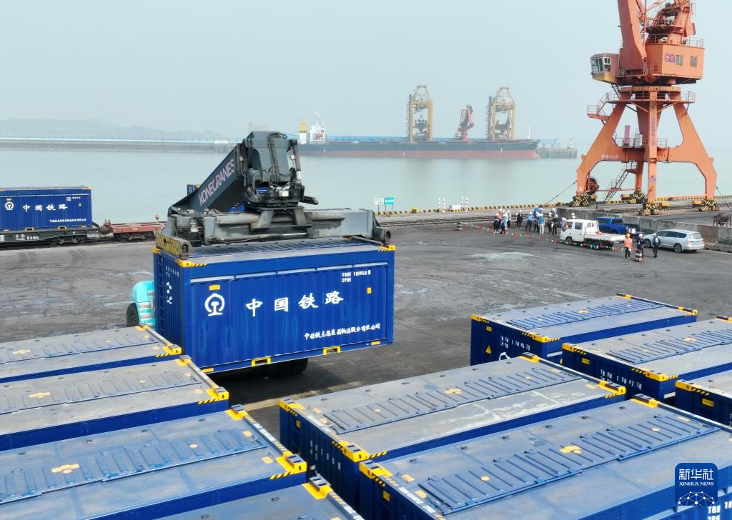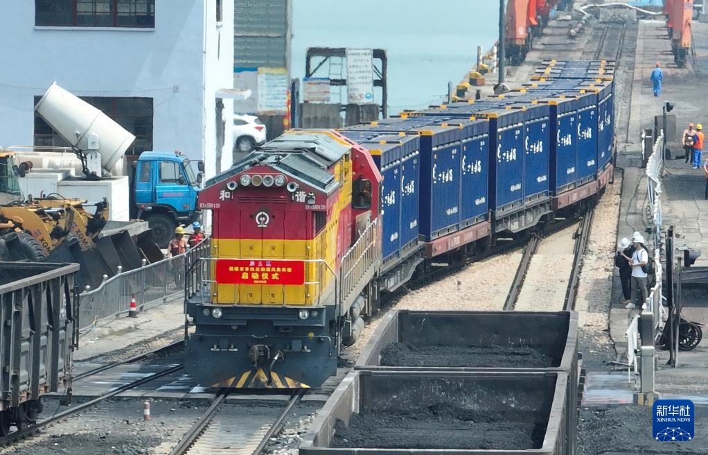 8月24日,搭载着14个装有豆粕的新型通风集装箱的48056次列车从泉州市泉港区施厝站驶出(无人机照片)。