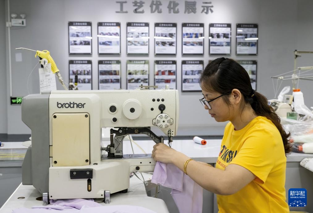 在福建天守集团服装研发车间,一名公司研发人员在研制服装生产新工艺(8月23日摄)。