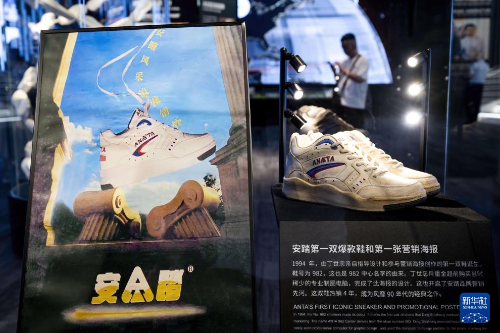 这是在安踏集团博物馆里展示的安踏第一双爆款鞋和第一张营销海报(8月22日摄)。