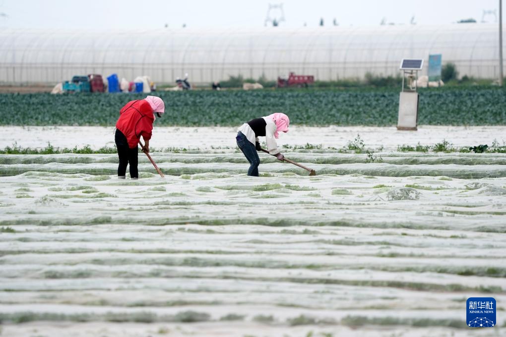 宁夏固原市原州区彭堡镇姚磨村瑞丰蔬菜产销合作社农户在田间锄草(8月24日摄)。