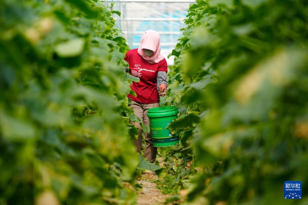 宁夏固原市原州区彭堡镇姚磨村瑞丰蔬菜产销合作社农户在温棚内采摘黄瓜(8月24日摄)。