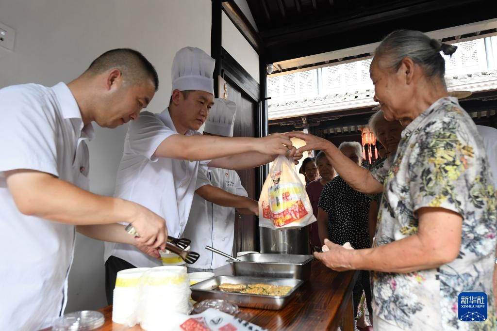 8月27日,在越都社区居家养老服务照料中心,孔乙己酒家的志愿者给来老年食堂用餐的居民发放“爱心餐”。