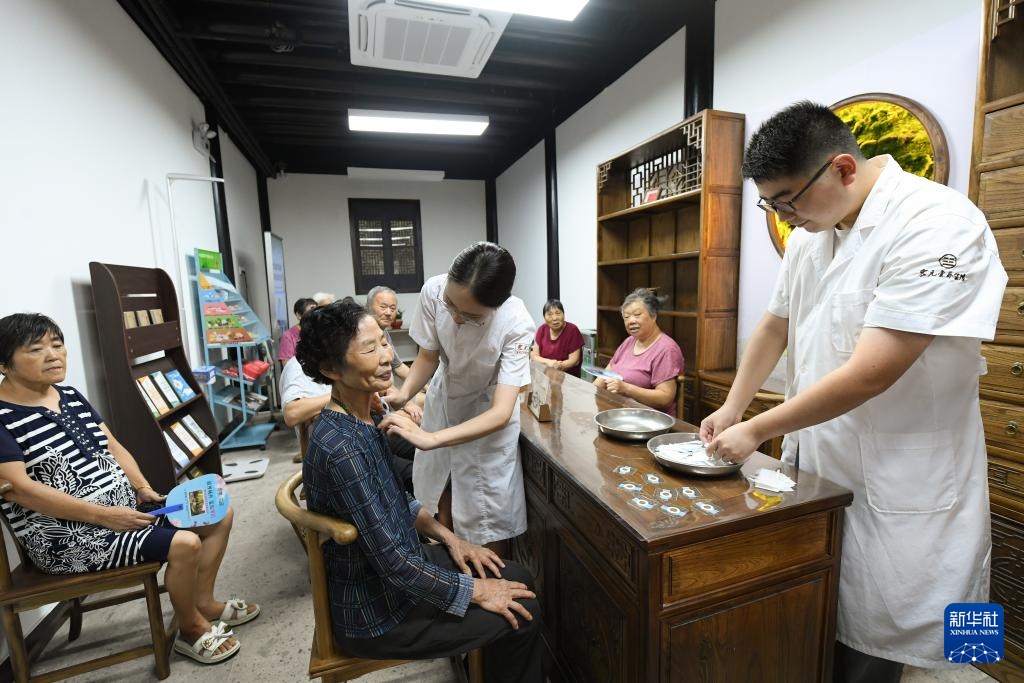 8月27日,在越都社区居家养老服务照料中心,百年老店“震元堂”的志愿者为居民免费进行贴敷。