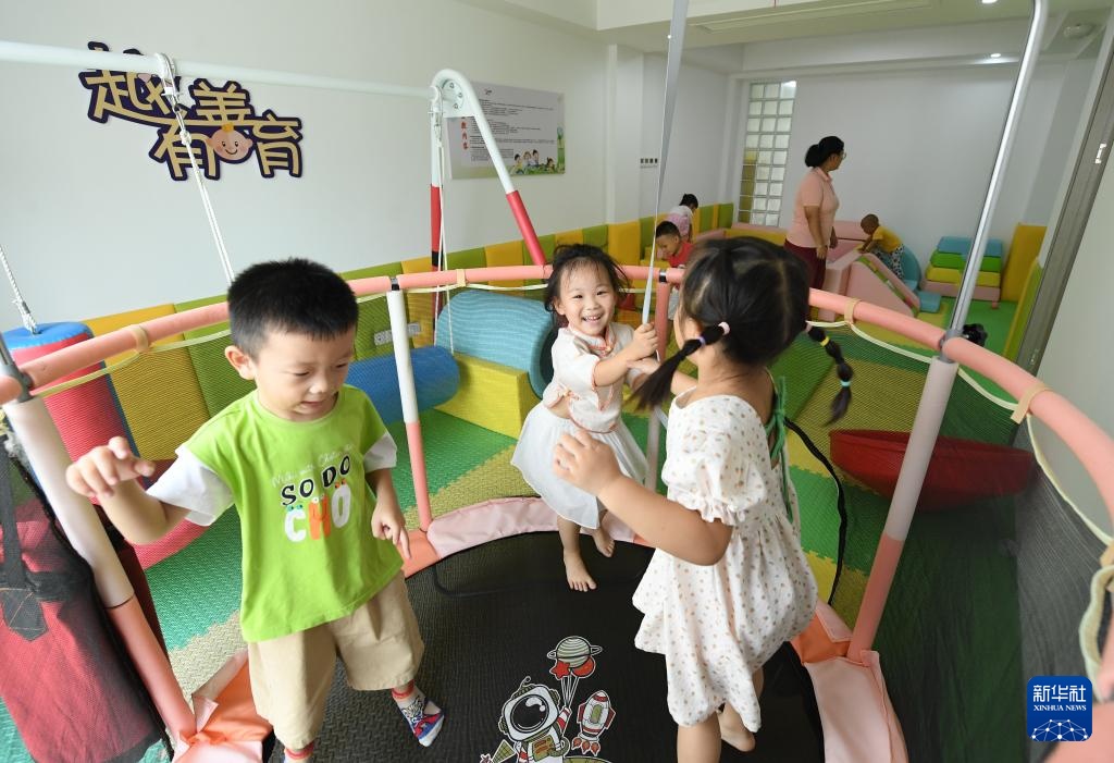 8月27日,在越都社区托育中心,儿童在工作人员的看护下玩耍。