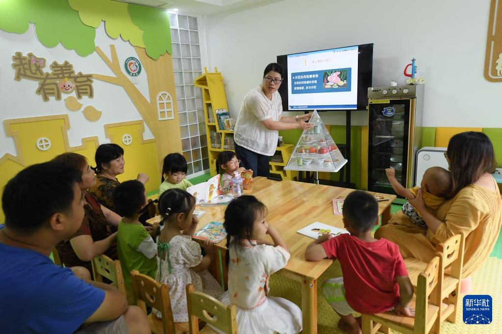 8月27日,在越都社区托育中心,绍兴市妇幼保健院的志愿者给孩子和家长讲授辅食搭配知识。