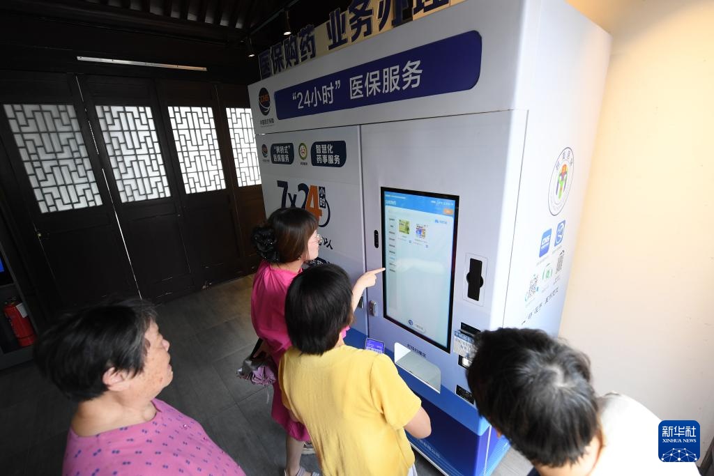 8月27日,在越都社区活动中心,居民在共建单位捐赠的24小时自助配药机上购买药品。